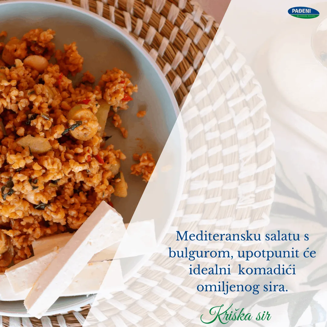 Kad se Bulgur ohladi dodati, krastavac narezan na kockice, crne ili zelene masline, na kockice narezan Kriška sir.
